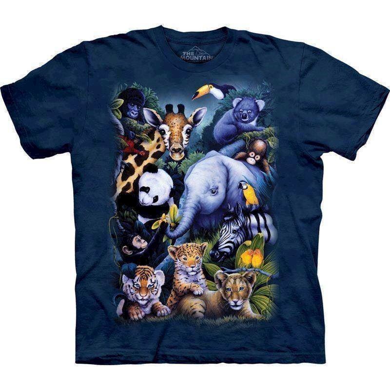 En fin collage bluse, som viser et forslag til den perfekte dyreverden, hvor alle dyr er venner. Giraffer, tigere og elefanter kan f.eks. Alle være venner her.