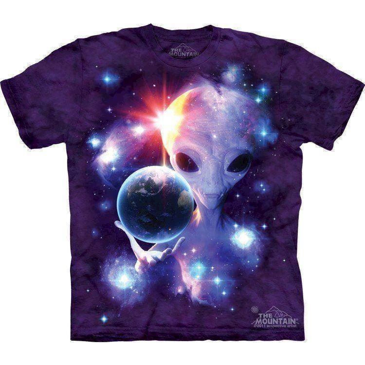 Der findes teorier, der går ud på, at livet på jorden er blevet "plantet" af rumvæsner, uvist af hvilke årsager. Der er varianter, f.eks. at de store civilisationer skulle have udenjordisk oprindelse. Der er ikke meget bevis for noget af dette, men her er i hvert fald en flot t-shirt med et rumvæsen, der holder jordens skæbne i sin hule, langfingrede hånd.