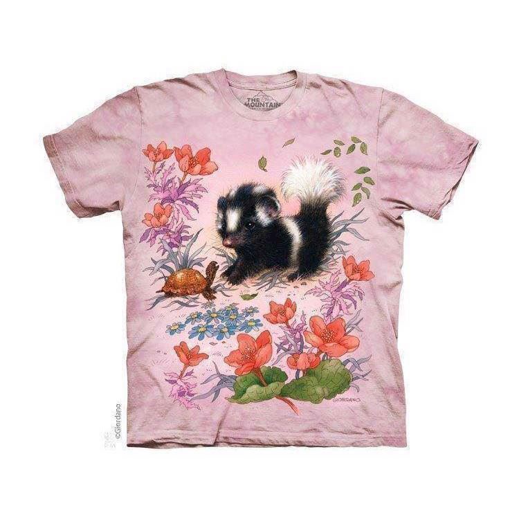 Et super sødt og uskyldigt motiv af en tegnet stinkdyrunge omringet af blomster. Med den lyserøde baggrundsfarve er denne t-shirt er perfekt til din lille datter, niece eller barnebarn