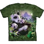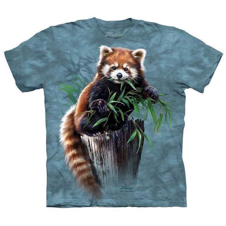 Denne t-shirt har fået et sødt dyretryk af en rød panda, som spiser nogle blade mens den sidder på en træstamme. Pandaen har et super sødt ansigtudtryk mens den kigger direkte på én.