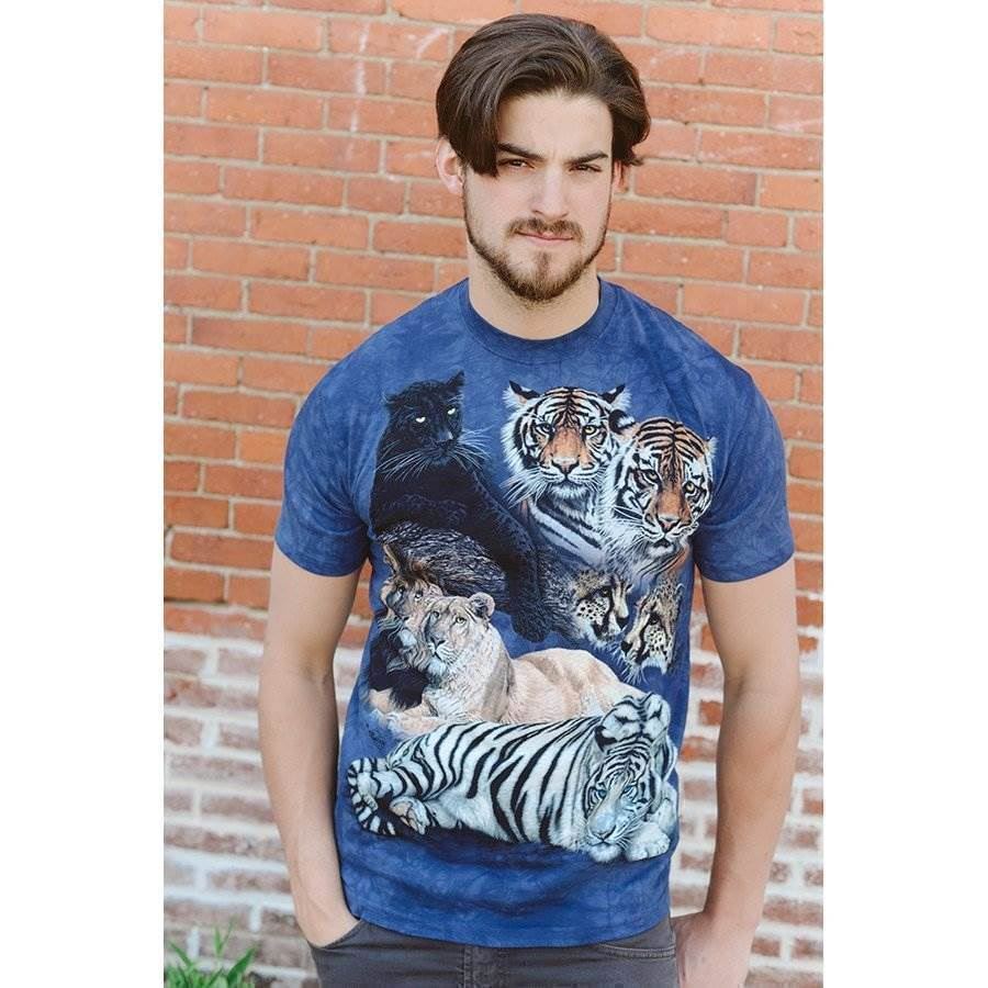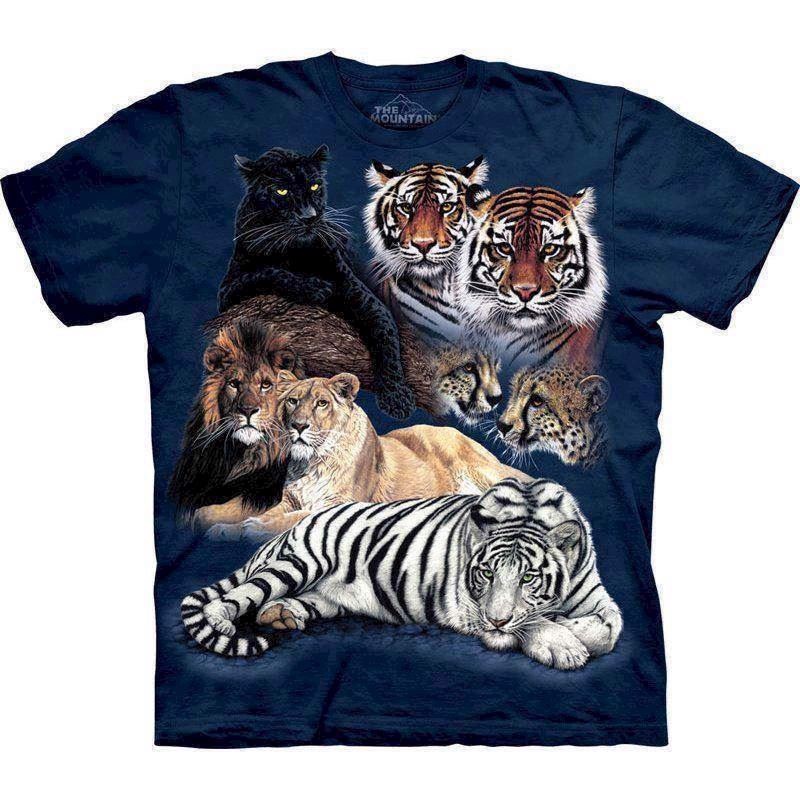 På denne bluse er alle de store katte forenet på en flot mørkeblå baggrund. Det er sjældent at disse dyr er samlet på ét sted og det giver et rigtigt unikt udtryk.