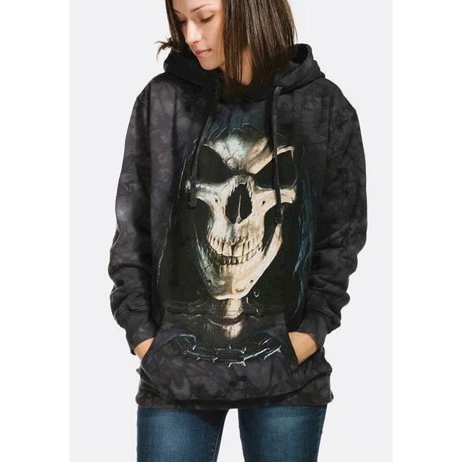 Super uhyggelig sort hoodie med et kranie, der tilsyneladende inden i trøjen. Spændende og dramatisk effekt. Gode kontraster med hvidt og sort.