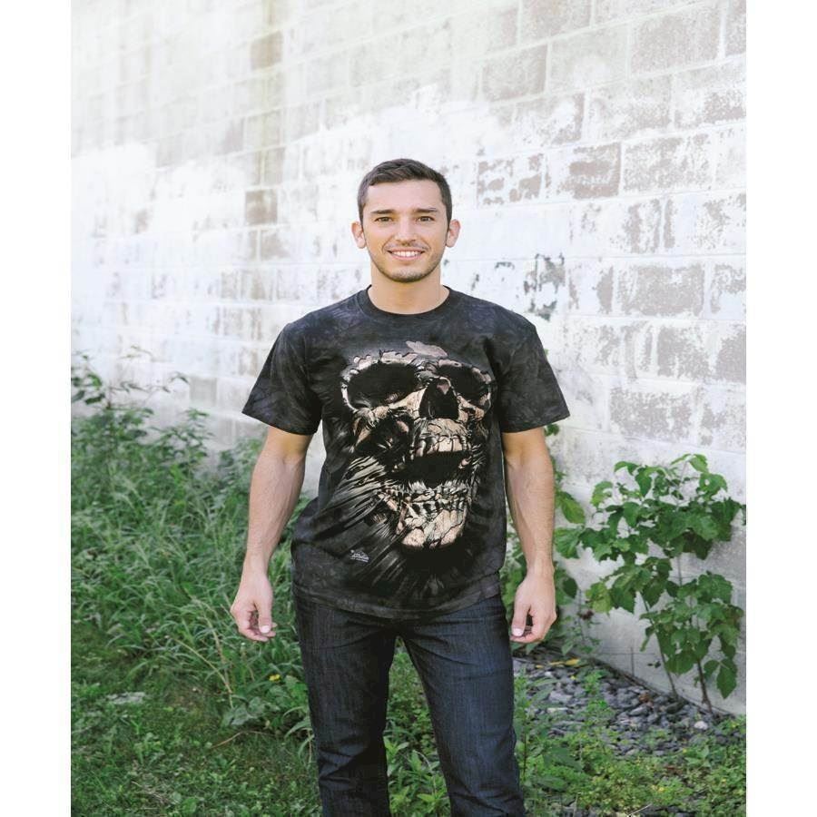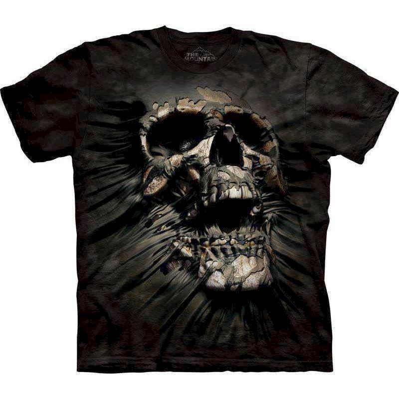 Superflot sort trøje med et kranie, der tilsyneladende bryder igennem stoffet. Spændende og dramatisk effekt. Gode kontraster med hvidt og sort.