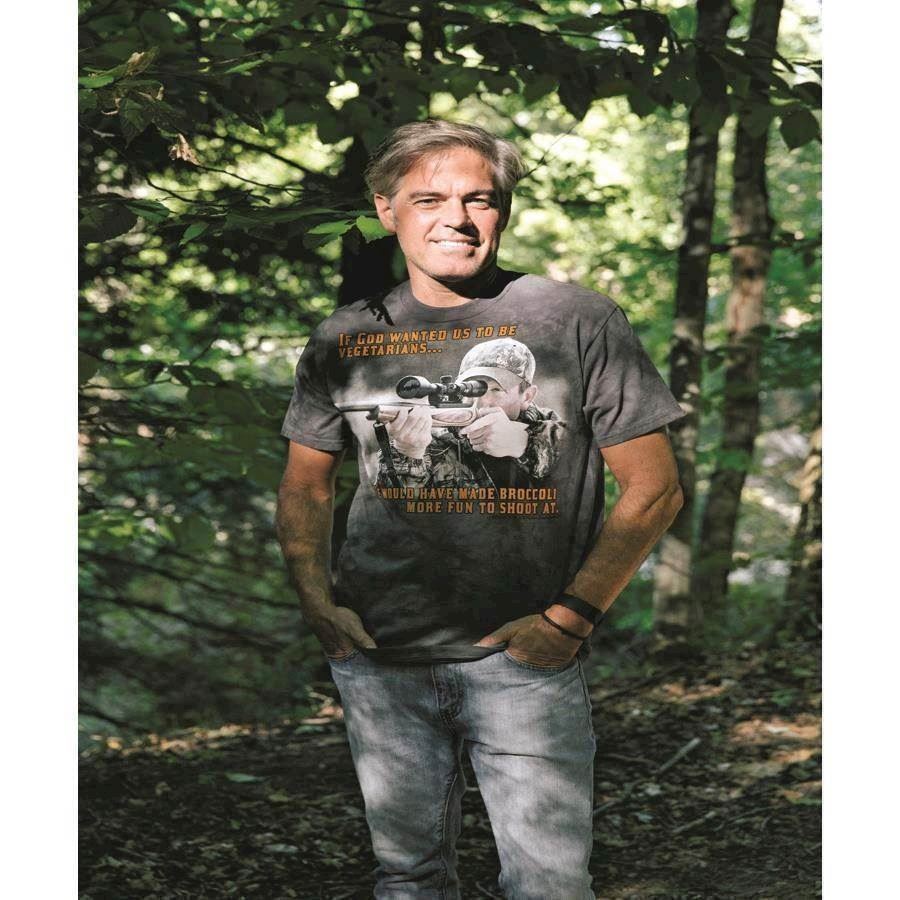 T-shirt med sjov tekst "Hvis Gud havde villet, at vi skulle være vegetarer, havde Han gjort broccoli mere sjovt at skyde efter."