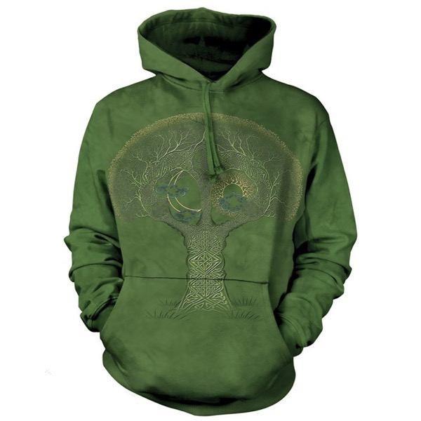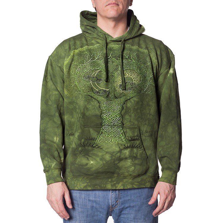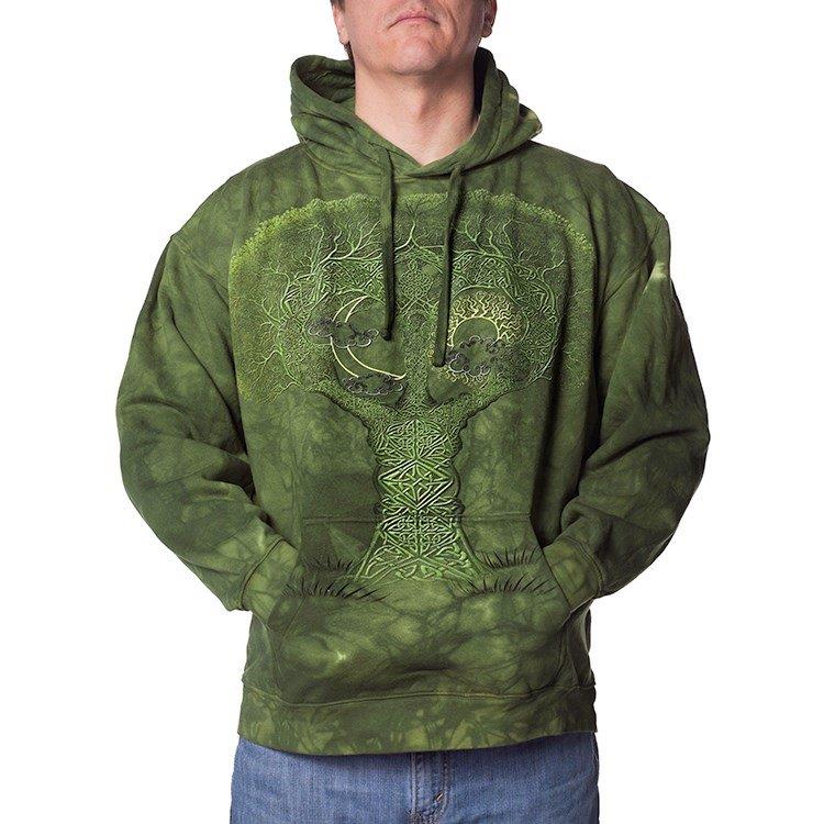 Grøn hoodie med motiv: Det keltiske livets træ, med sol og måne blandt grenene. Tilhængere af de nordiske guder vil kunne nikke genkendende til meget af dette. Fremstillet i respekt for naturen; 100% økologisk bomuld og naturvenlige farver.