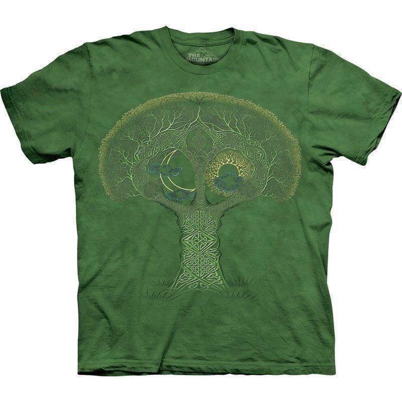 Grøn t-shirt med motiv af det keltiske livets træ, med sol og måne blandt grenene. Tilhængere af de nordiske guder vil kunne nikke genkendende til meget af dette. Fremstillet i respekt for naturen; 100% økologisk bomuld og naturvenlige farver.
