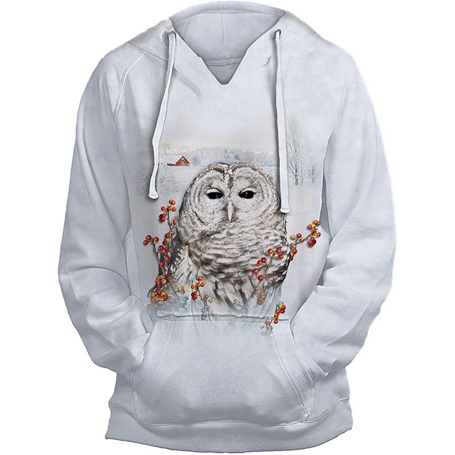 Denne V-hoodie emmer af vinter og hygge. Med et motiv af en ugle, der sidder og puster sig op i det flotte snedækkede landskab.
