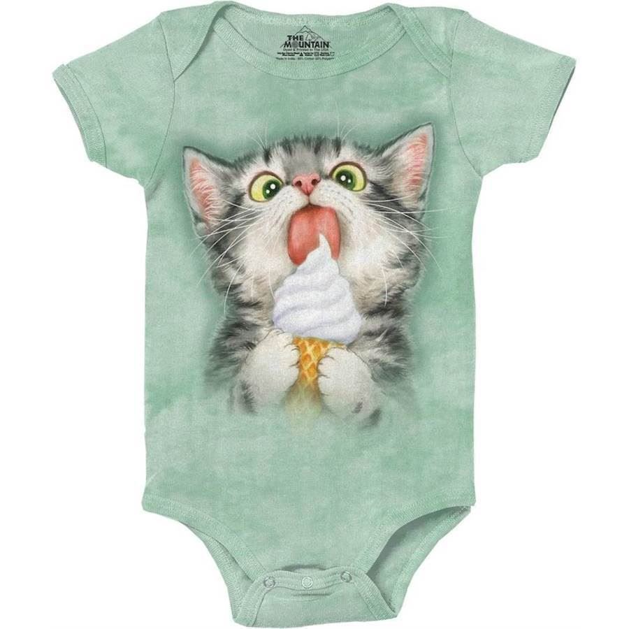 Morsomt kattemotiv med kat der spiser en isvaffel - bodystocking i blød bomuld med kemikaliefri indfarvet motiv.