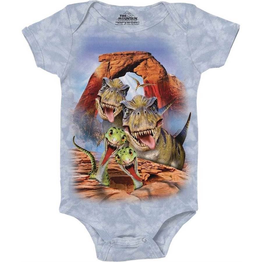 Lækker baby body med motiv af en dino selfie - i blød bomuld med kemikaliefri indfarvet motiv.