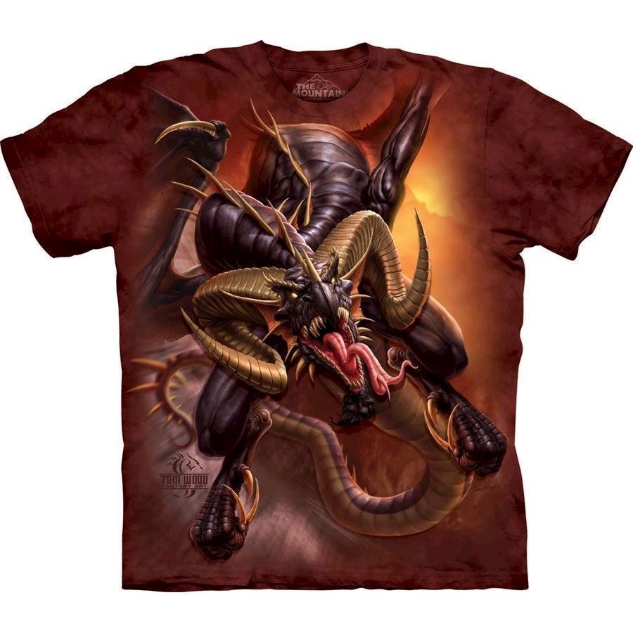 Flor sort drage på livlig rød baggrund. Virkeligt levende motiv, der nærmest springer frem fra trøjen.