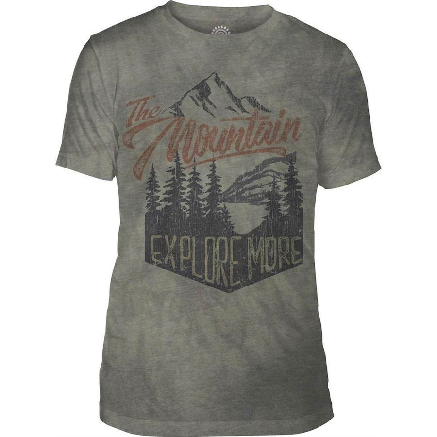 Explore More er med motiv af et bjerg bag toppen af en nåleskov og budskabet om at udforske vores skønne natur. Super flot triblend tee fra The Mountain.