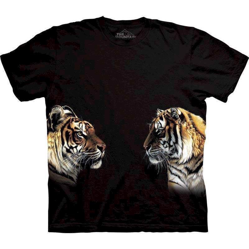 En enkel og flot t-shirt med to tigere, som sidder i hver sin side på blusen. Deres flotte orange farver står fint til den sorte baggrund og kan bruges til alle slags bukser.