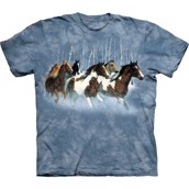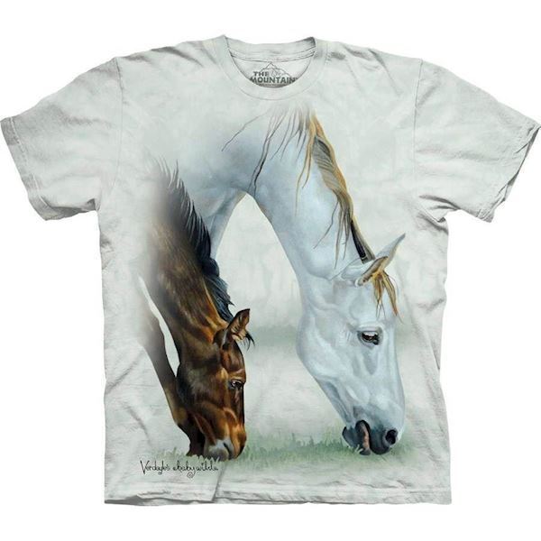 Trøje med et sødt billede af to heste, en hoppe og et hoppeføl. Denne t-shirt har en off-white baggrund og nedtonede farver, en smuk bluse til alle, der holder af heste.