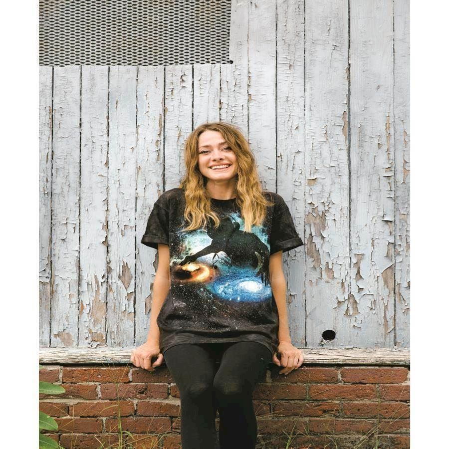 Flot og farverig sort t-shirt med en galaktisk DJ, der "spinner plader" på et par galakser. God gave til kosmiske DJs.