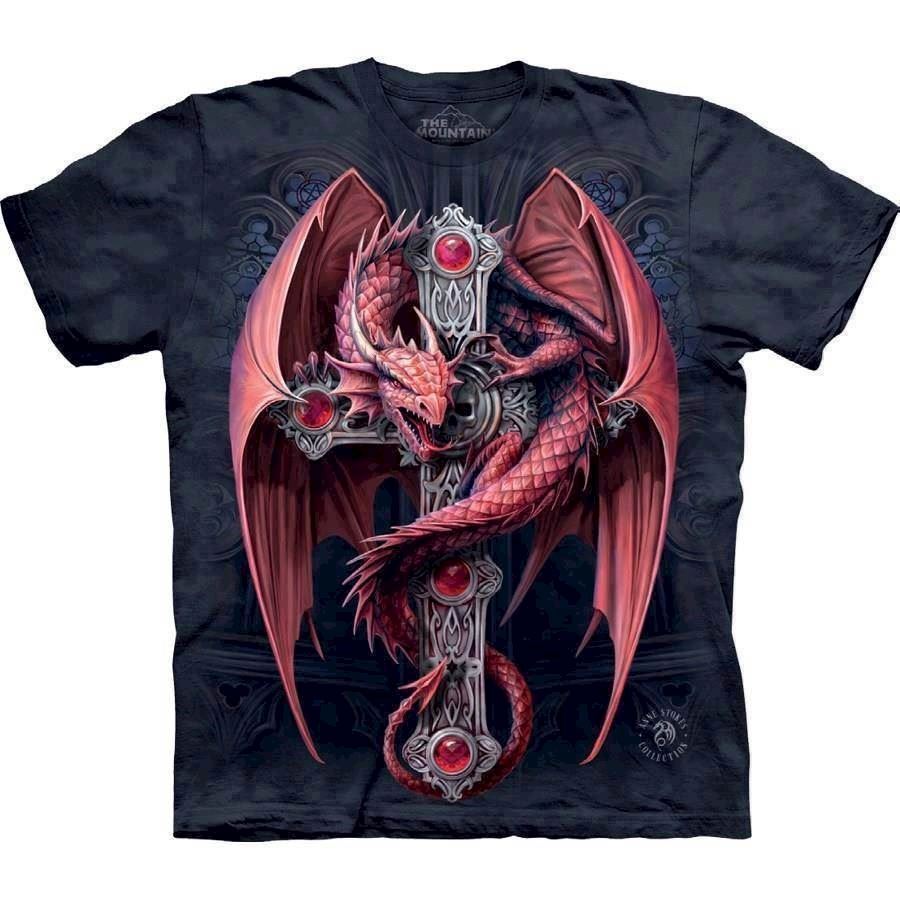Sort t-shirt med rød drage, der slynger sig om et sølvkors med rubiner. Et dramatisk fantasy-motiv på denne trøje.
