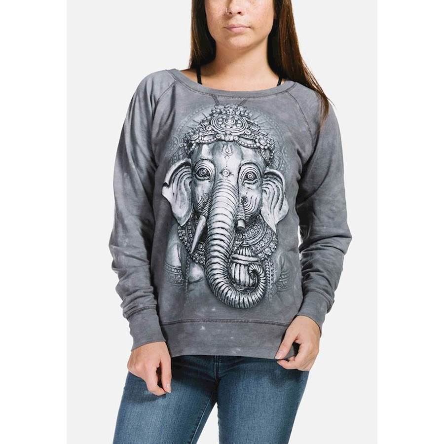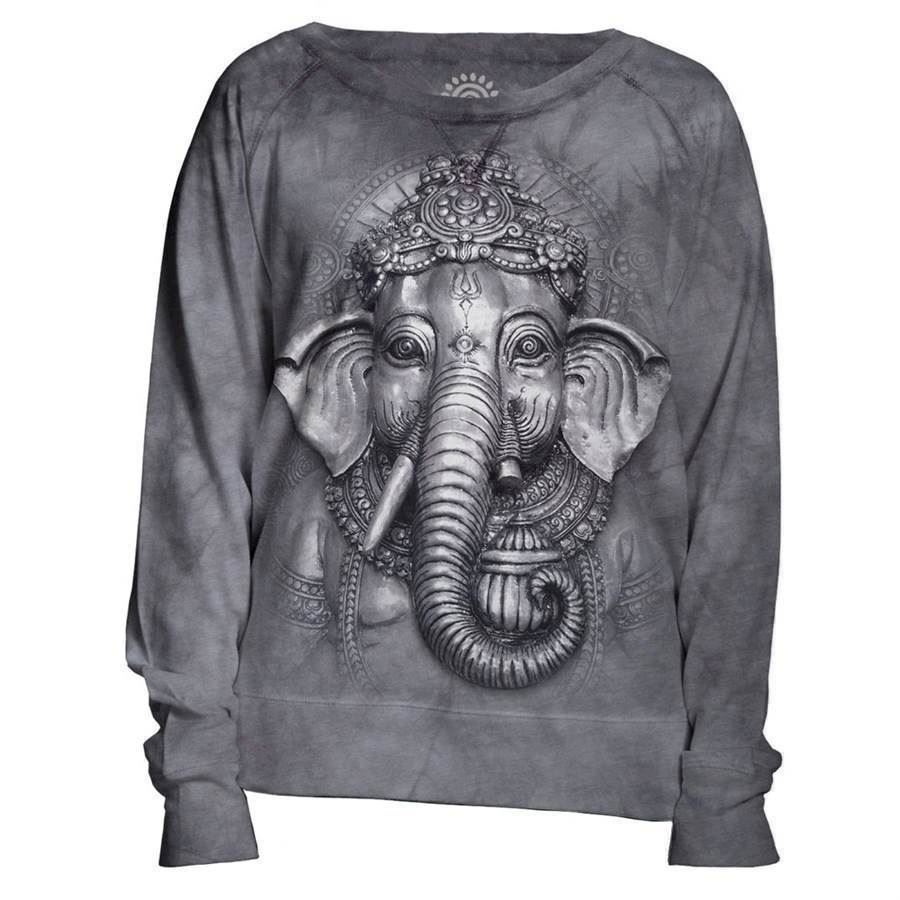 Grå sweatshirt i kvindemodel med bådformet hals. Til de knap så varme dage i Danmark har vi også langærmede bluser, som du kan få med de smukkeste motiver. Her ses f.eks. en udsmykket elefant.