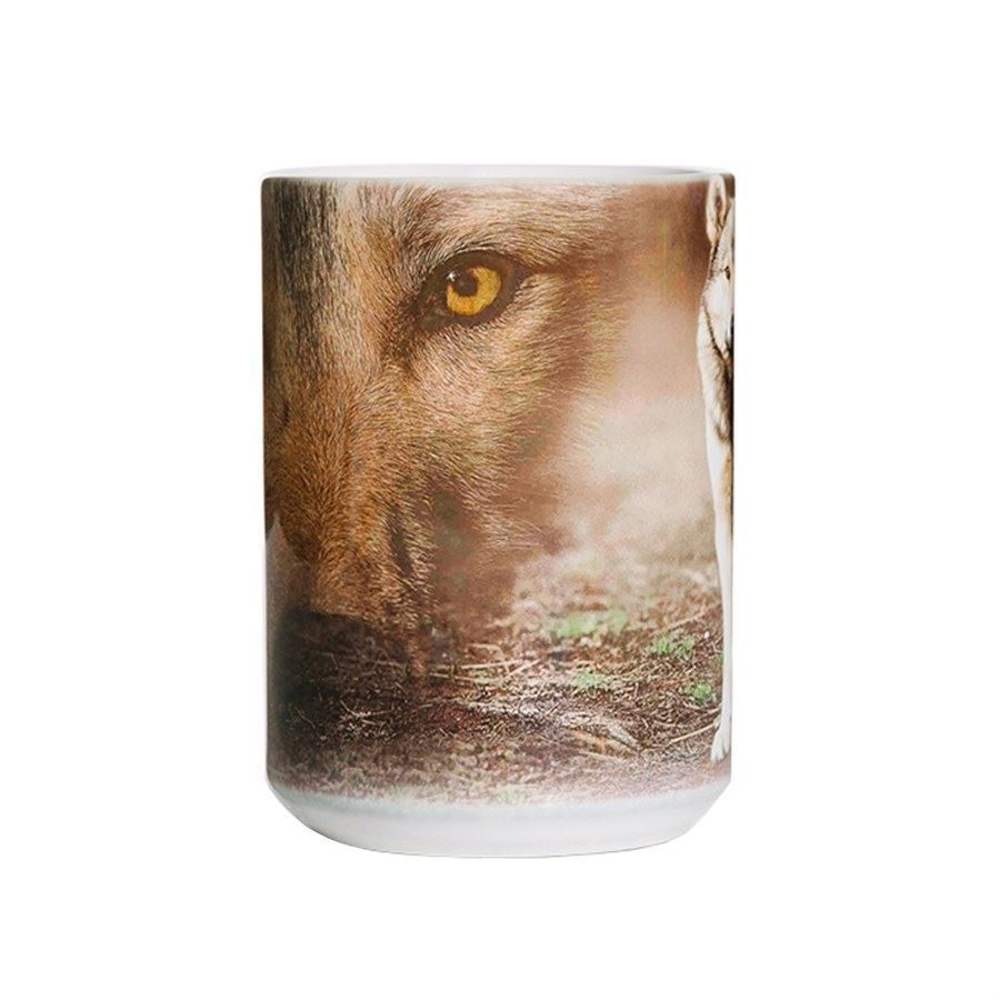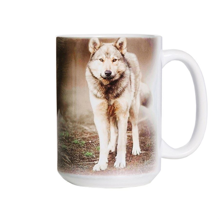 Kaffekrus med portræt af en ulvKeramik tekop med grå ulv