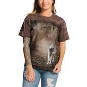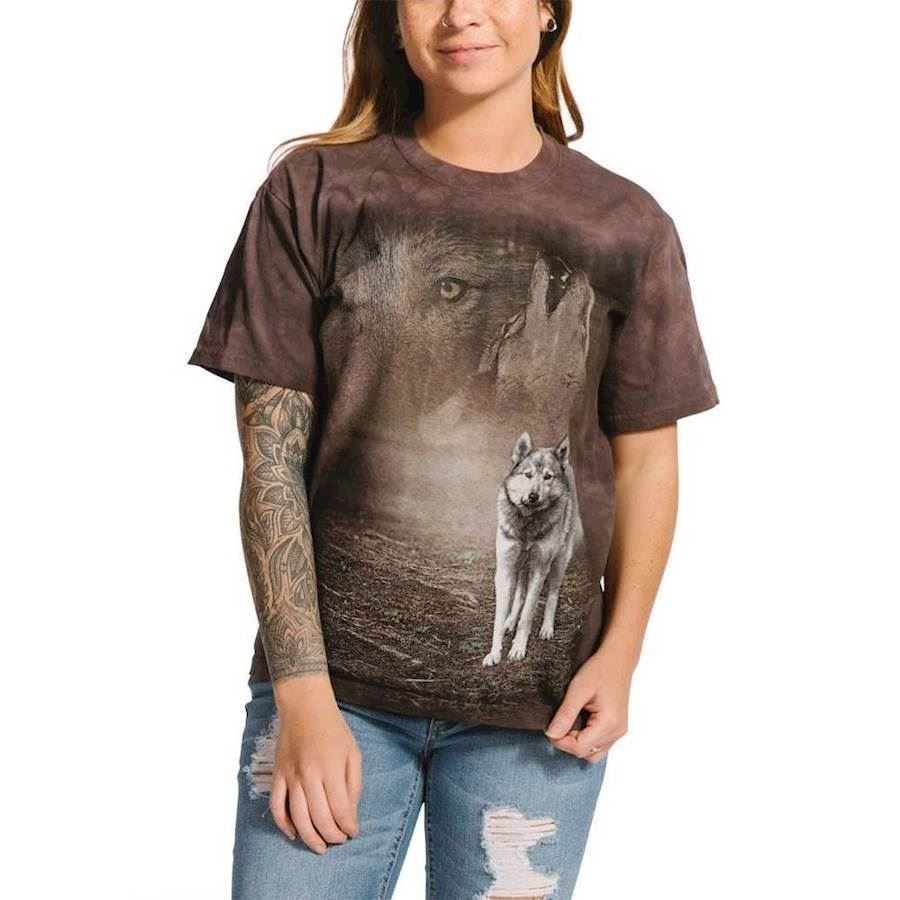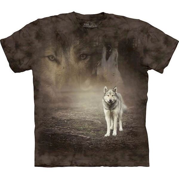 T-shirt med imponerende ulvemotiv. Ulven i skoven og ulvens afskygninger i skoven illustreres på denne kortærmede bluse.