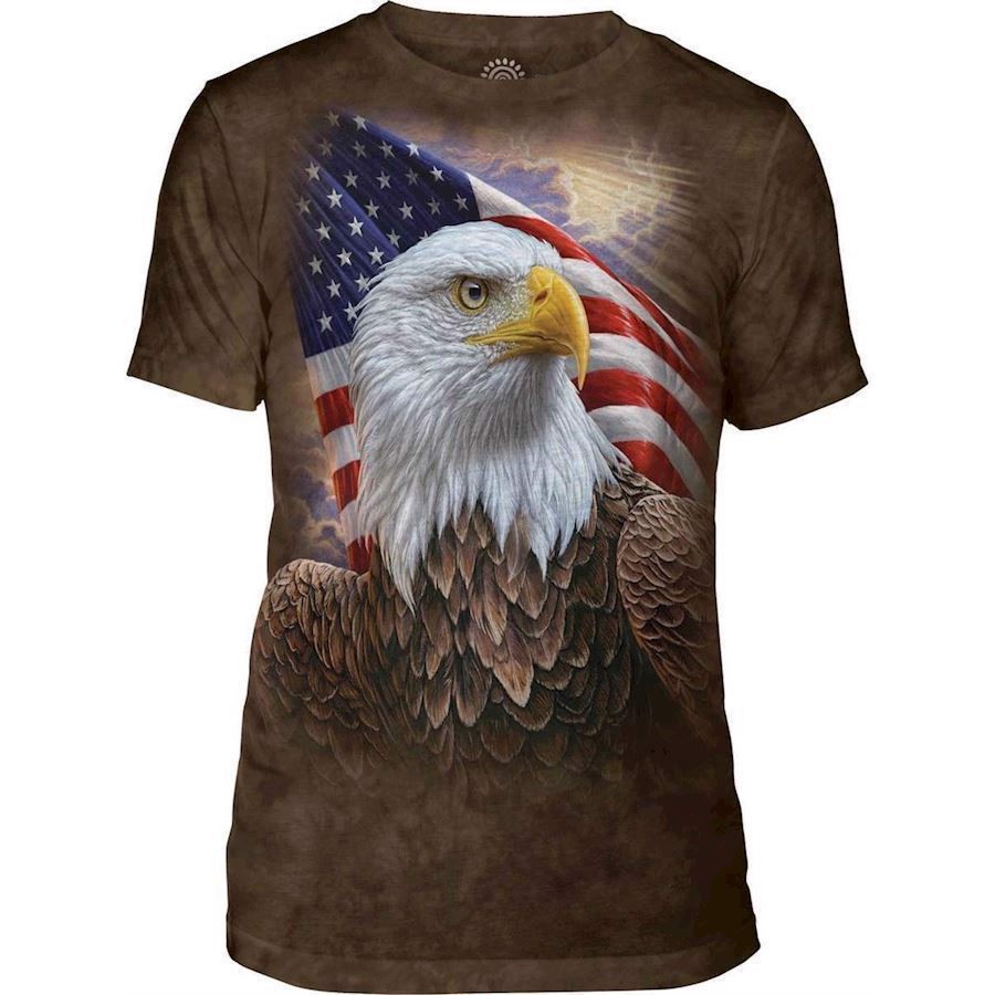 Ørn i profil på baggrund af en flagrende amerikansk flag. Super flot triblend tee fra The Mountain.
