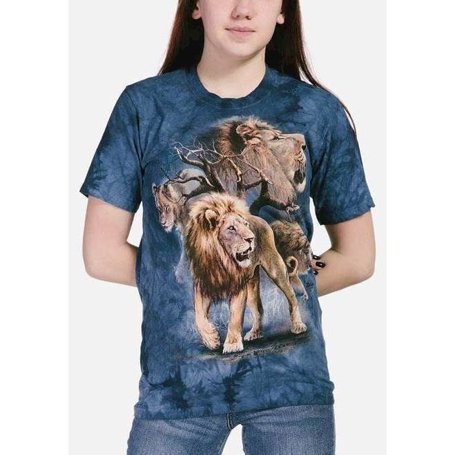 En smuk t-shirt med flere løver på samme motiv. Billedet skaber en dyster stemning med det visne træ i baggrunden, hvilket er en super effektiv måde at skabe en stemning på.