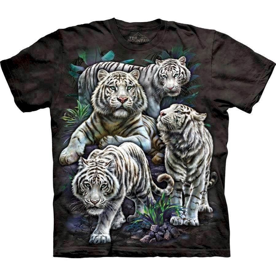 T-shirt med hvide tigre. Den hvide tiger er en farvevariation af den bengalske tiger. De er flot reproduceret i dette print på sort baggrund, hviket skaber en smuk kontrast.