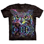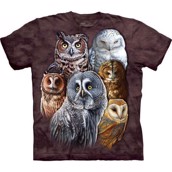 Flot blå t-shirt med et magisk ugle-motiv, med en kvinde og to sneugler, der fungerer som budbringere. Sneuglen kan faktisk træffes i Danmark, hvis man er meget heldig, men du skal nok ikke bede den om at tage et brev med.