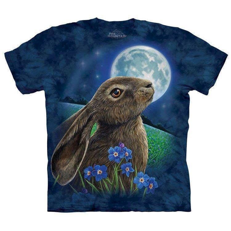 Et fint billede af en hare som kigger op mod månen. Harer er super søde i virkeligheden og det er de naturligvis også på vores t-shirts hos ZooShirts.