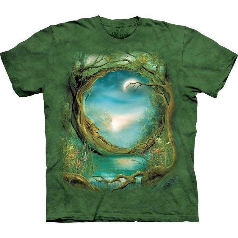 Flot grøn t-shirt med natur-motiv, et træ slynger sig om halv-månen og spejler sig i en lille sø.