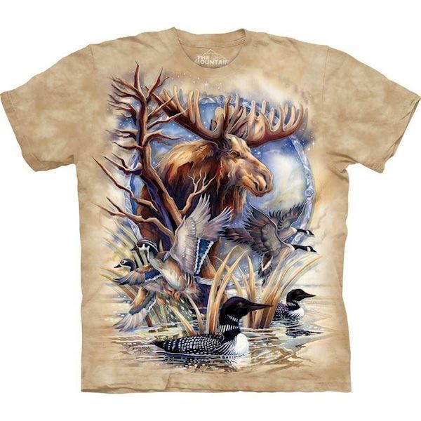 T-shirt med lomme-fugle og elg. Den nordlige fugl, lommen, hedder "loon" på engelsk, og er nærmest Canadas nationalfugl, afbildet på den canadiske 1-dollar-mønt, en "loonie". Her er "the loon" sammen med en elg og canada-gæs på denne t-shirt.