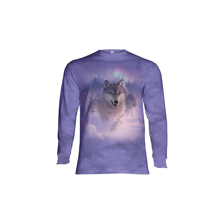 Et super fedt og kunstnerisk motiv af tre ulve, der løber i sneen, med nordlys i baggrunden. Hvis du er vild med ulve, er denne bluse lige hvad du mangler i dit klædeskab.