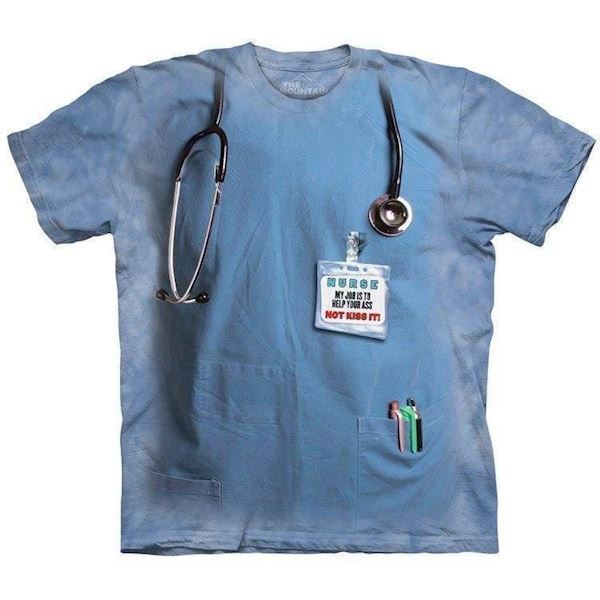 En t-shirt, der får enhver til at fremstå som sygeplejerske. Komplet med stetoskob, navneskilt og kuglepenne.