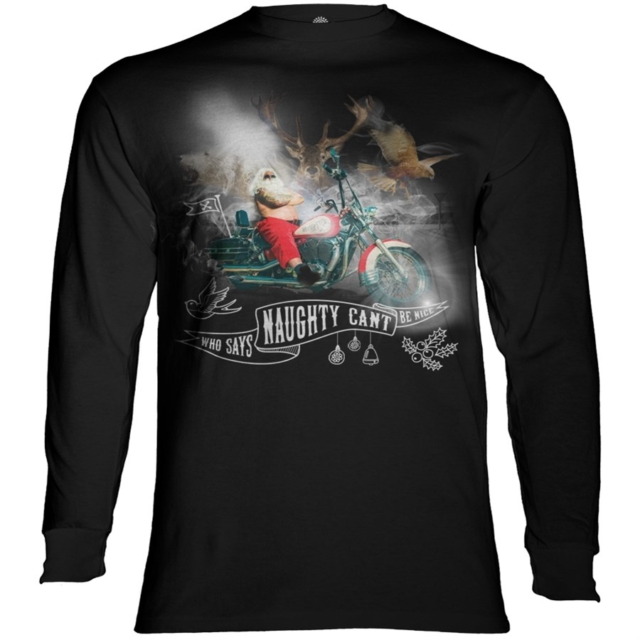 Who says naughty can´t be nice? Sjov langærmet bluse med julemand i bar overkrop på motorcykel.