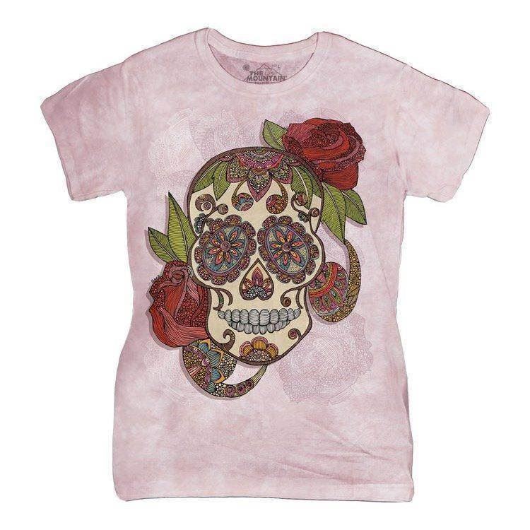 Rosa t-shit med persisk inspireret paisleymønstret motiv, et sukkerkranie fra Dia de Muertos. Så kan vi dårligt tage fra flere kulturer. Flot og friskt motiv, der nærmest springer frem fra trøjen.