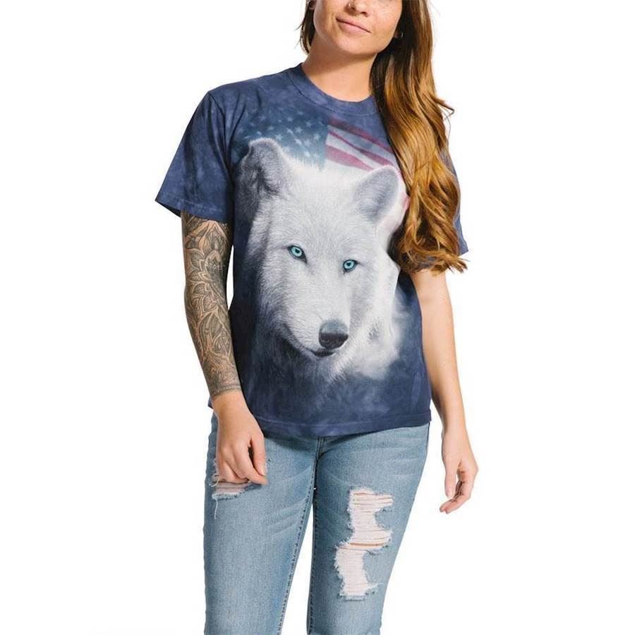 T-shirt med hvid ulv kunstnerisk fremstillet på baggrund af det amerikanske flag. Et budskab om patriotisme.