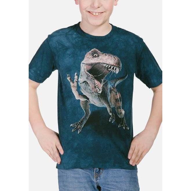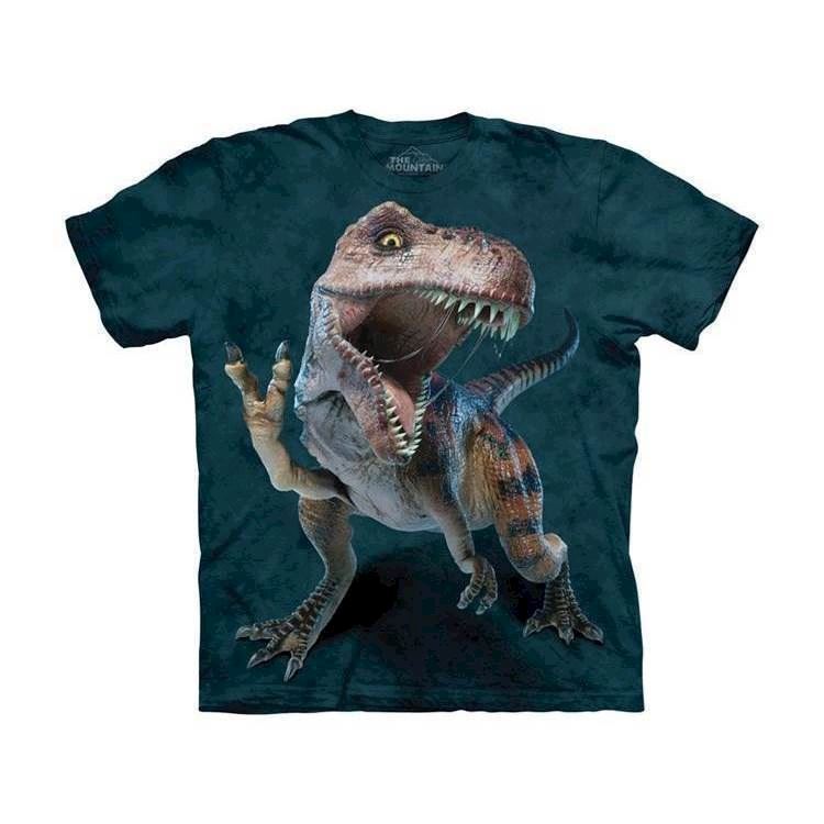 T-shirt til børn med T-Rex. Det er svært at sige, hvordan dinosaurene så ud dengang de levede på jorden, men det her motiv har vidst fanget denne ret godt. Når man ser dinosaurens størrelse, så er det godt at de ikke lever i dag.