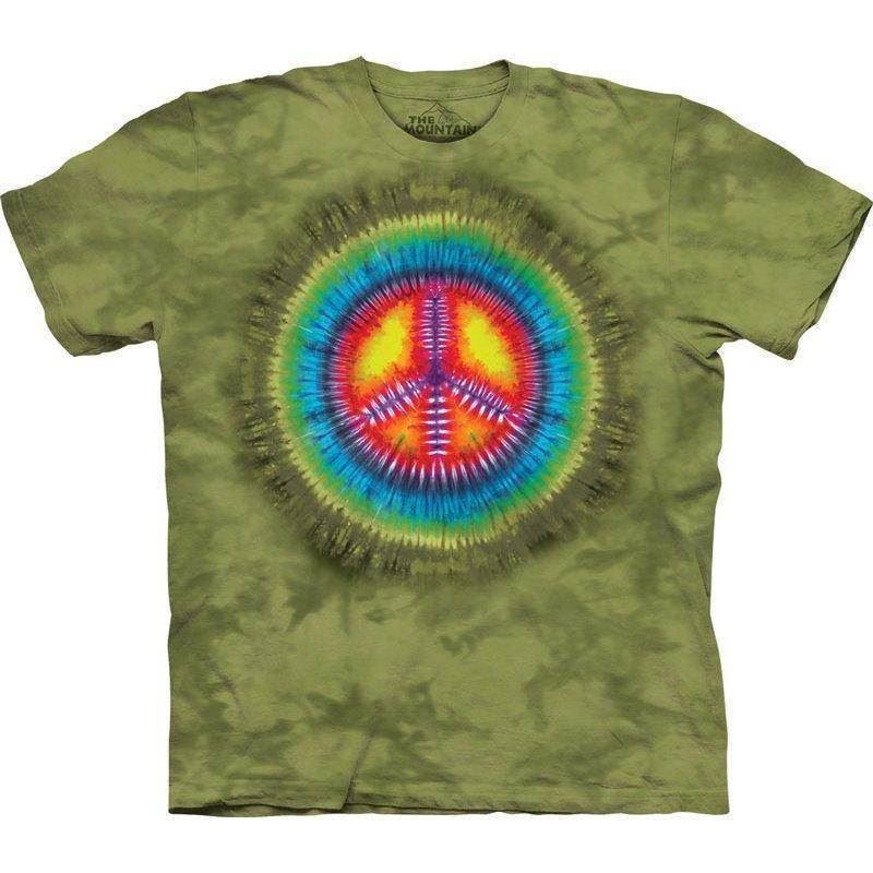 Flot grøn t-shirt med "tie-dye"-inspireret fredssymbols-tryk. "Tie-dying" er farveteknikken, som blev brugt flittigt i 60-erne, hvor man binder snore om stoffet, før man nedsænker tøjet i farvevæsken. Det giver denne flotte effekt. Det bliver ofte kaldt "batik-tryk", men batik involverer voks til at holde farven i motivet.