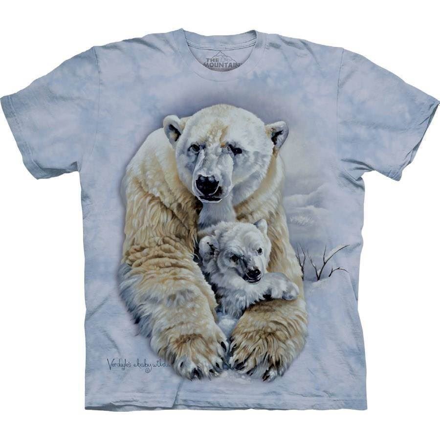 T-shirt med isbjørne. To bjørne, en voksen og en unge, ligger på sneen. Isbjørne findes kun nord for polarcirkelen, hvor solen aldrig går ned om sommeren, og aldrig står op om vinteren. Der er masser i Grønland, men hvis du ser dem dér, skal du nok løbe hurtigt væk. De er farlige rovdyr.