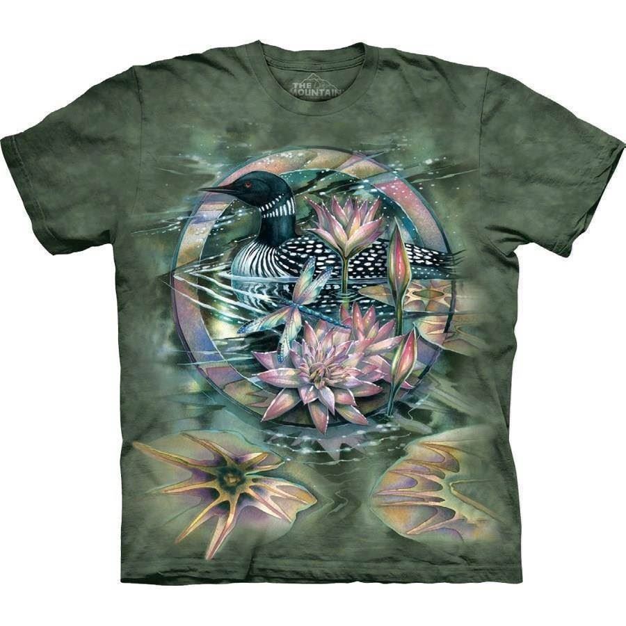 T-shirt med fugle. En lom i vandet. Lommer kan faktisk næsten ikke gå, og tilbringer det meste af deres tid i vandet. Flot motiv med åkander.