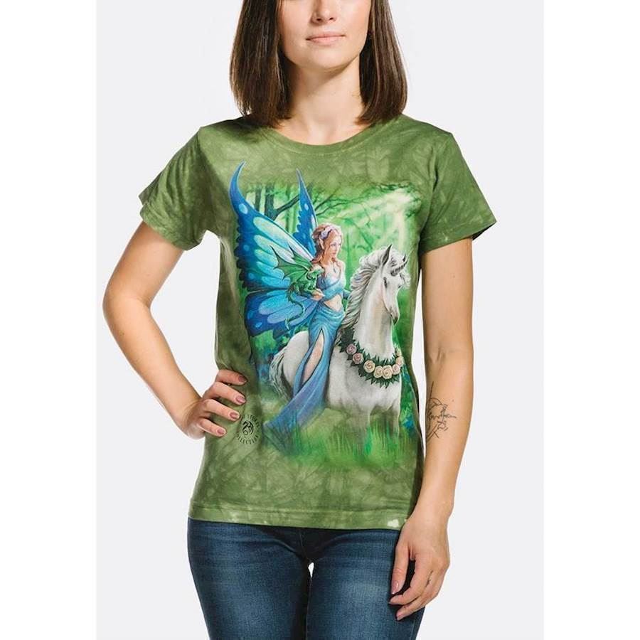 Eventyrlig trøje med fantasy-motiv: En fe, som sidder på en enhjørning. Flot effekt, hvor skoven nærmest åbner sig af blusen. Lækker meleret/marmoreret grøn baggrund.