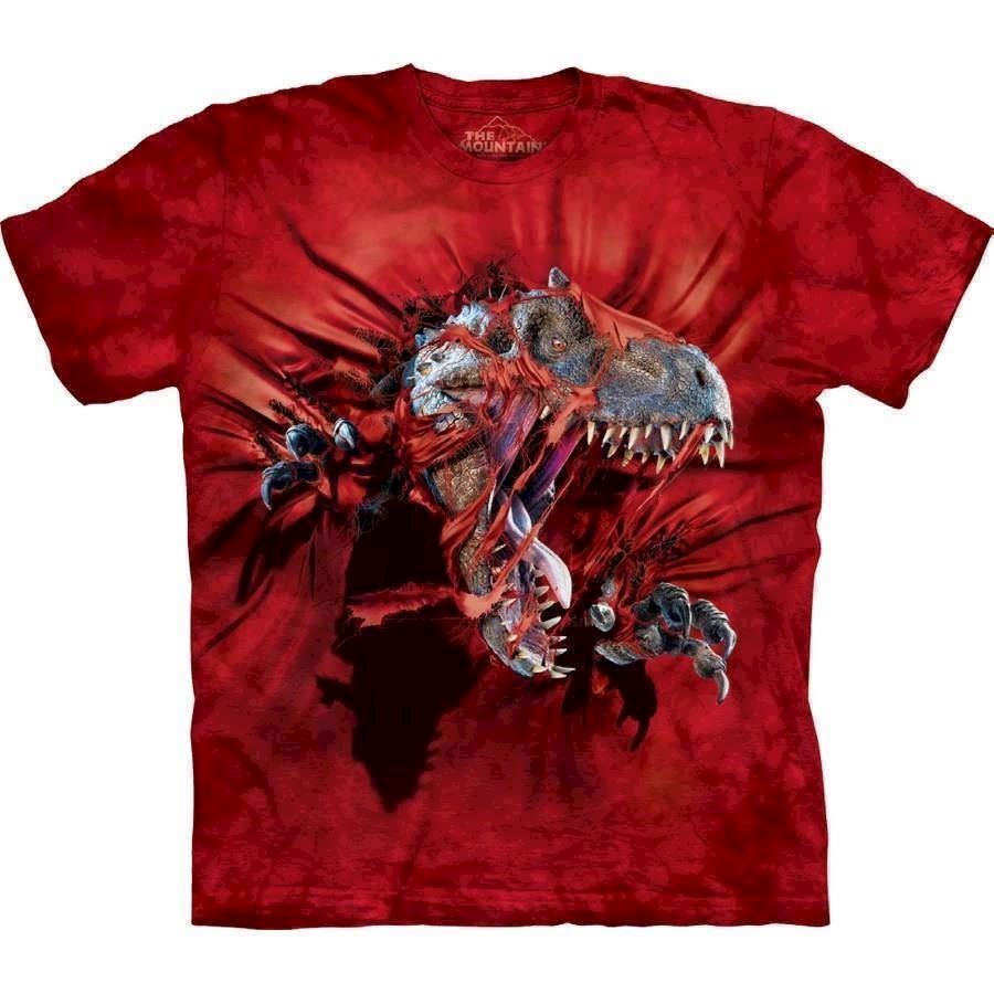 T-shirt med tyranosaurus rex, der river sig igennem trøjen. Flot rød bluse med en overraskelse.