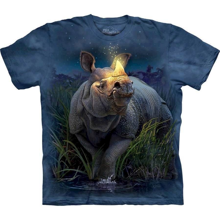 T-shirt med næsehorn, hvor ildfluer lyser hornet på næsen op. Flot mørk trøje, der næsten virker selvlysende.