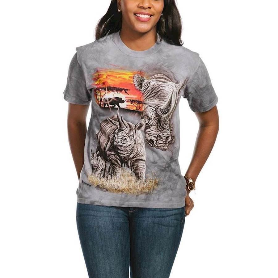 T-shirt med collage af næsehorn i solnedgangen. Super flot kortærmet bluse med mange forskellige næsehorn på savannen.