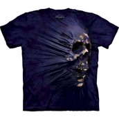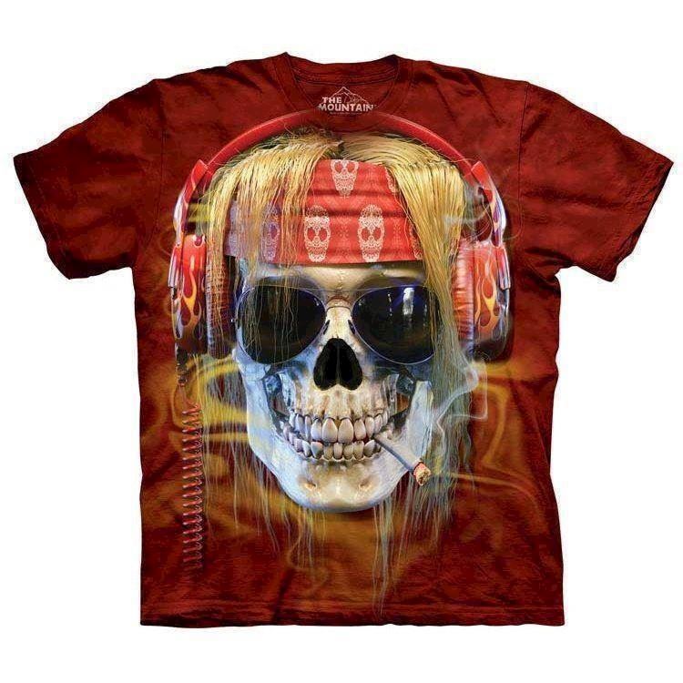 Flot rød t-shirt med rocker-kranie, med smøg imellem tænderne og hovedtelefoner.