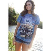 En trøje der hylder til Route 66, den første amerikanske trans-continentale "highway", fra Chicago to Los Angeles. Den havde sin storhedstid i 50'erne, men allerede i 30'erne bevægede utrolige folkemængder sig af vejen mod Californien, i håb om en bedre tilværelse. T-shirt'en er flot himmelblå med motorcykler og en "Diner".