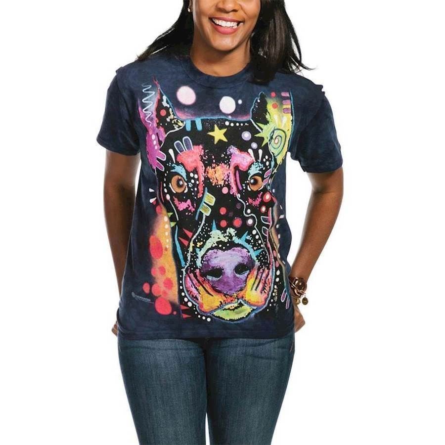 Elsker du hunde og især hunderacen doberman er dette et must-have for dig. Man kan næsten ikke modstå dette søde ansigt og de flotte farver, som t-shirten er dekoreret med