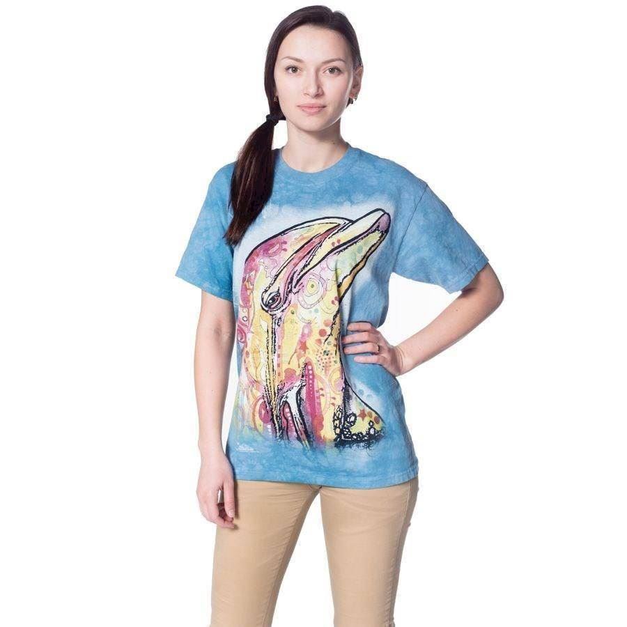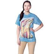 Kunstnerisk motiv af delfin i mange smukke farver. De flotte farver står i god kontrast med den lyseblå baggrund.