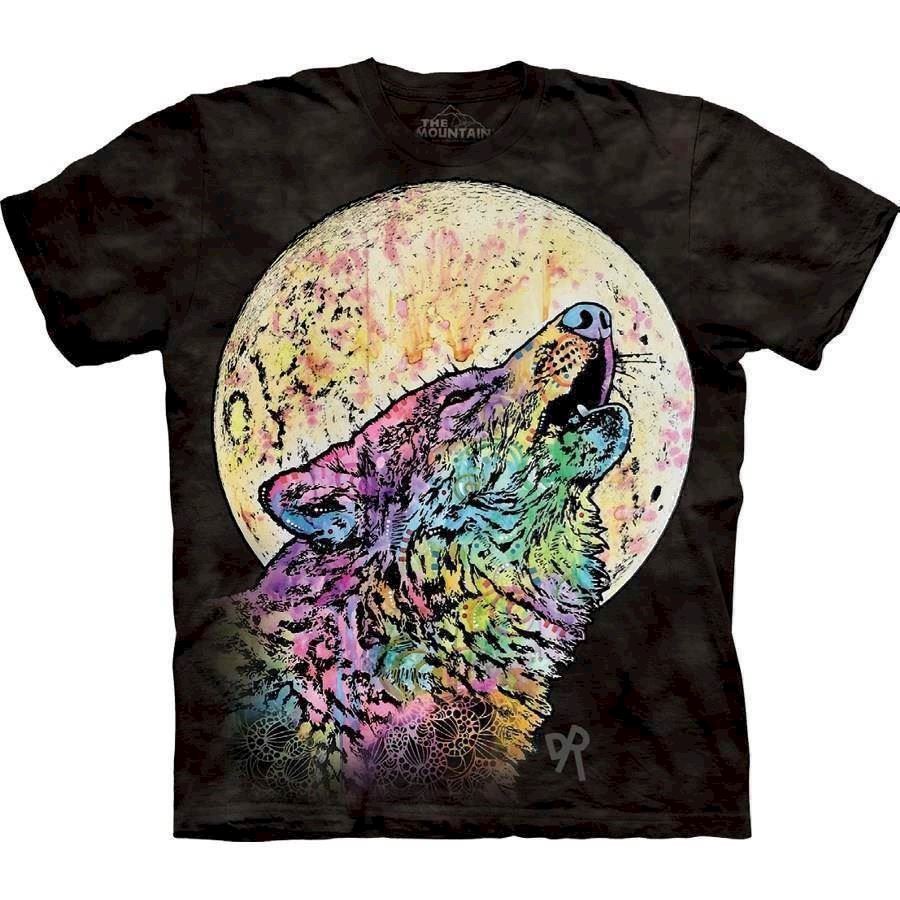 Kunstneren Dean Russos bud på det klassiske "ulv hyler mod månen"-motiv. Sort t-shirt med farverigt design.