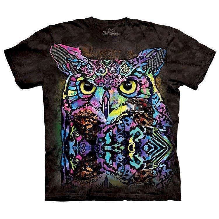 Ugler er et smukt dyr og vi har mange forskellige ugle motiver på vores t-shirts. Her ses for eksempel et uglemotiv lavet af kunstneren Dean Russo, som er kendt for brug af smukke farver.