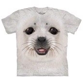 T-shirt med babysæl. En sælunge er nok noget af det mest bedårende, der findes. Den hvide pels og de store sorte øjne kan få de fleste til at smelte. Her er en flot trøje med sælernes unger på en krystalblå baggrund.