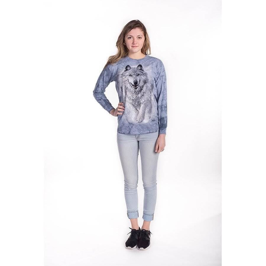 Meget flot og sødt motiv som viser en ulv i sneen. Billedet giver en rolig følelse og passer perfekt indenunder en blazer eller cardigan i kolde tider.